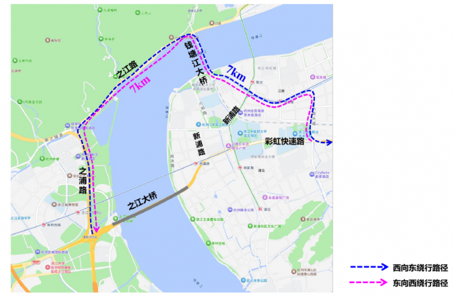 之江大桥施工期间,过往车辆可通过 “之浦路—之江路—钱塘江大桥” 绕行,请留意交通指引,小心驾驶。