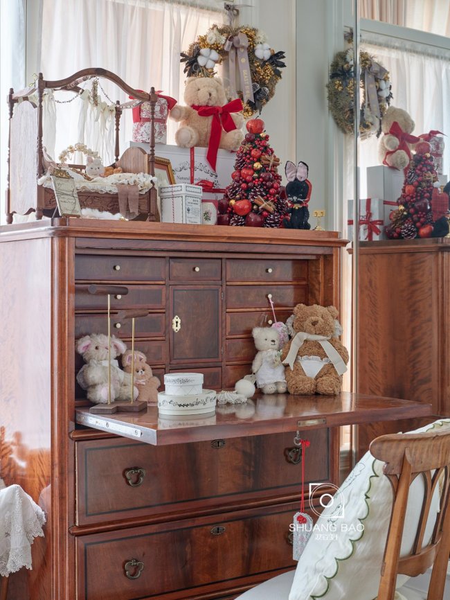 室内姿态各异的玩偶都是女主人的宝贝,华美闪耀而不浮夸。环视整个衣帽间,它承载着非常多的女主人的情感,室内的每一件物什都是丰富而立体的存在。