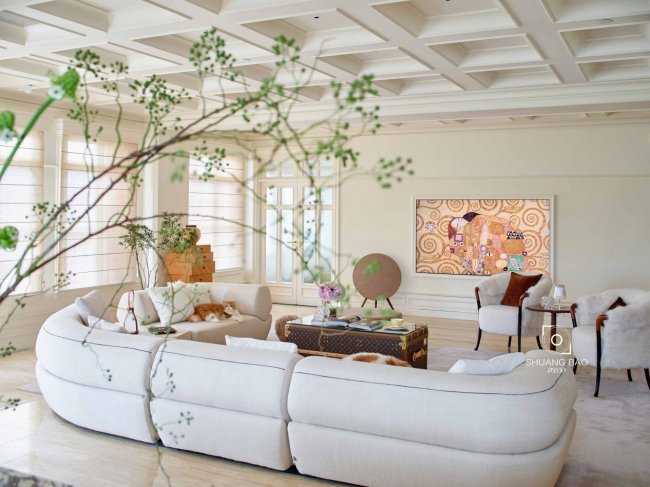 主沙发是来自意大利品牌的B&B沙发,柔软亲肤又带有支撑,以半围合姿态营造温和舒适的氛围。低饱和色调的手工地毯淡雅不失韵味,沙发上的LV钟形台灯,在夜幕降临时散发柔和暖光,将温柔传递到整个空间。