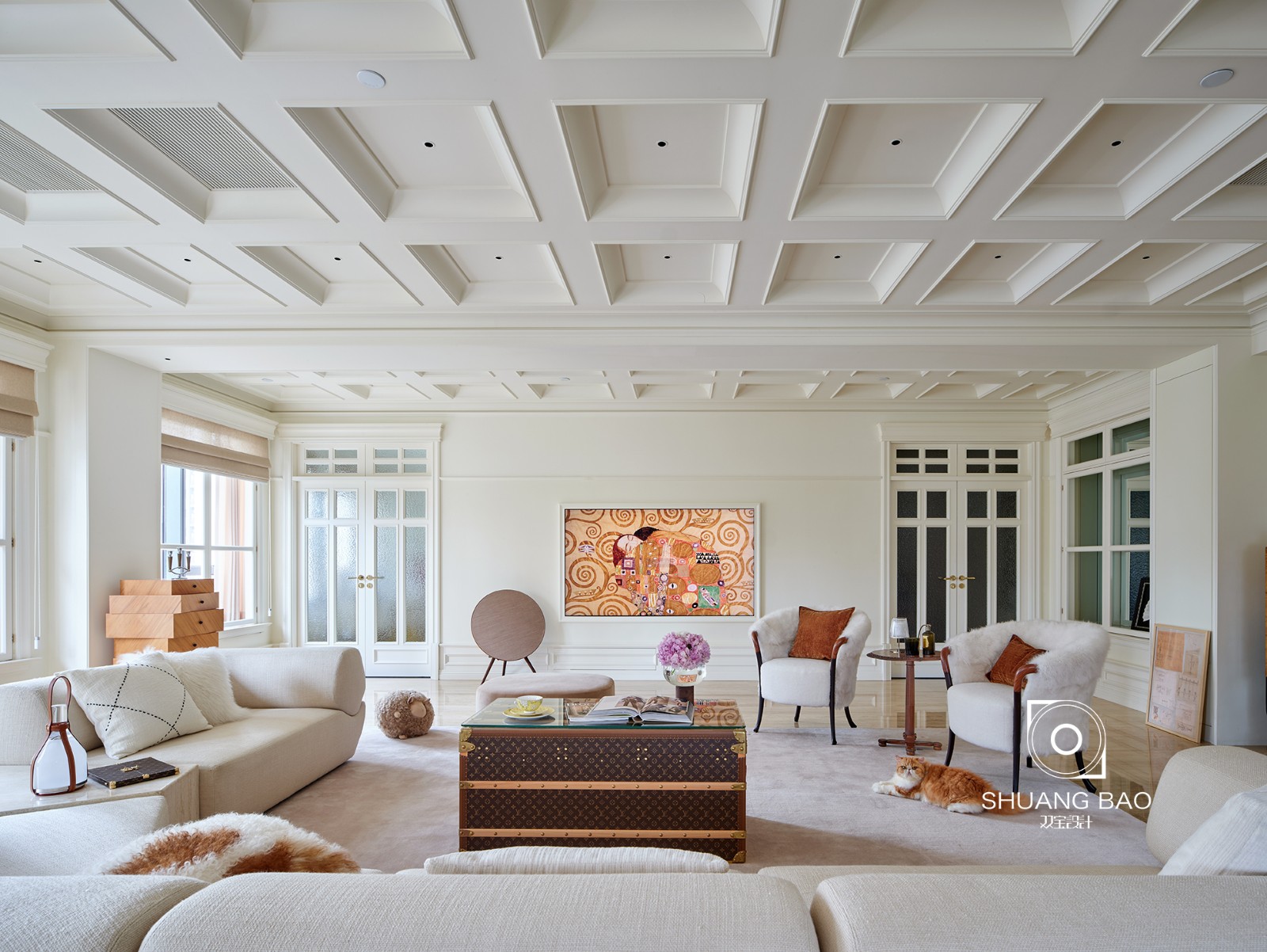 设计师依据屋主的喜好,强化空间的文化格调与情怀,将对生活美学的思考藏于收纳之中。天花板上饱满立体的法式雕花,绚烂又精致,勾勒出浓郁的浪漫主义气息。