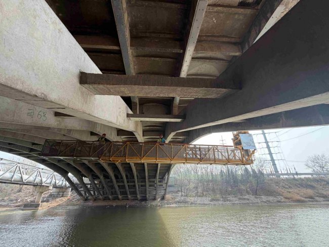 持续跟踪监测,科学“体检”深挖病害根源。中心始终将C级桥梁作为日常管护的重中之重。本次检测严格遵循《城市桥梁养护技术标准》,采用“桁架式桥检车+人工抵近巡检+超声波回弹仪”相结合的方式,对果园路沙王沟桥、崇德五大道杨庄沟桥、叶堤口大桥及天衢路运河桥进行全方位“深度体检”。