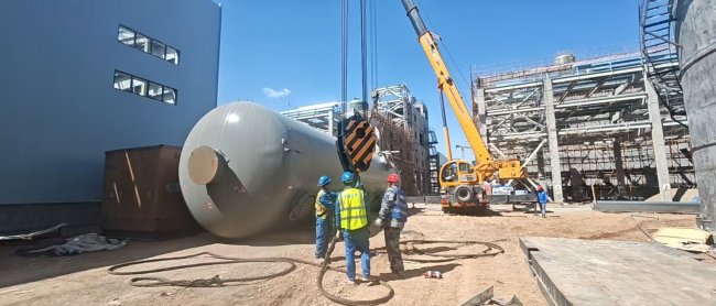 据悉,单台氯气洗涤塔设备高19.35米,直径4.2米,设备重量43.8吨,为电解工序单元核心设备,体积庞大、重心偏移,吊装难度大、精度要求高,需穿越厂区既有钢结构框架,作业空间受限。为确保吊装顺利完成,项目管理团队提前谋划,组织技术骨干编制专项吊装方案,多次精准测算吊具受力、吊装路径及场地承载能力。同时,对吊装设备进行全面检修调试,对作业人员进行安全技术交底,筑牢安全质量防线。吊装过程,采用350吨履带吊主吊、80吨汽车吊辅助递送的方式,通过单主机抬吊递送法将设备精准起吊,并从13.5米高的框架顶部穿下,一次成功就位。