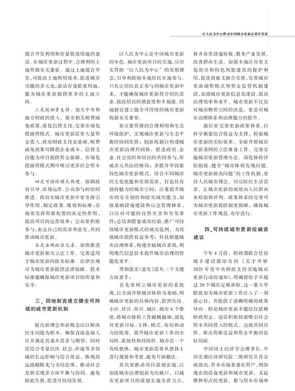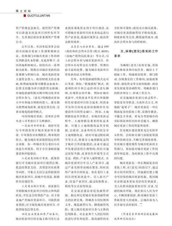 城市更新是一项长期而复杂的系统工程,在《意见》的指引下,通过各方的共同努力,因地制宜建立健全可持续的城市更新机制,我国城市必将迎来更加美好的发展前景,为人民群众创造更加宜居、宜业、宜游的城市环境。我们要以人民为中心,不断探索创新,推动城市更新工作取得更大的成效,让城市成为人民幸福生活的家园。(作者系东中西部区域发展和改革研究院院长)来源:今日国土2025年05期
