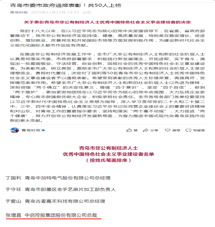 11月12日,青岛市公示了《关于表彰青岛市非公有制经济人士优秀中国特色社会主义事业建设者的决定》,中启控股集团党委书记、总裁张增昌等50人光荣上榜。