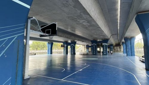 昌运桥下,5个标准全场篮球场整齐排布,塑胶地面整洁平整,遮风挡雨的设计让运动不受天气影响,免费开放的模式更是惠及周边居民,成为“10分钟健身圈”的核心节点。