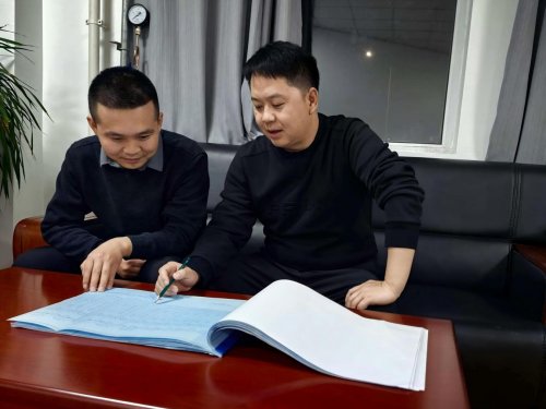 王强(右一)与李伟博(左一)深夜审查施工图纸(杨治国摄)